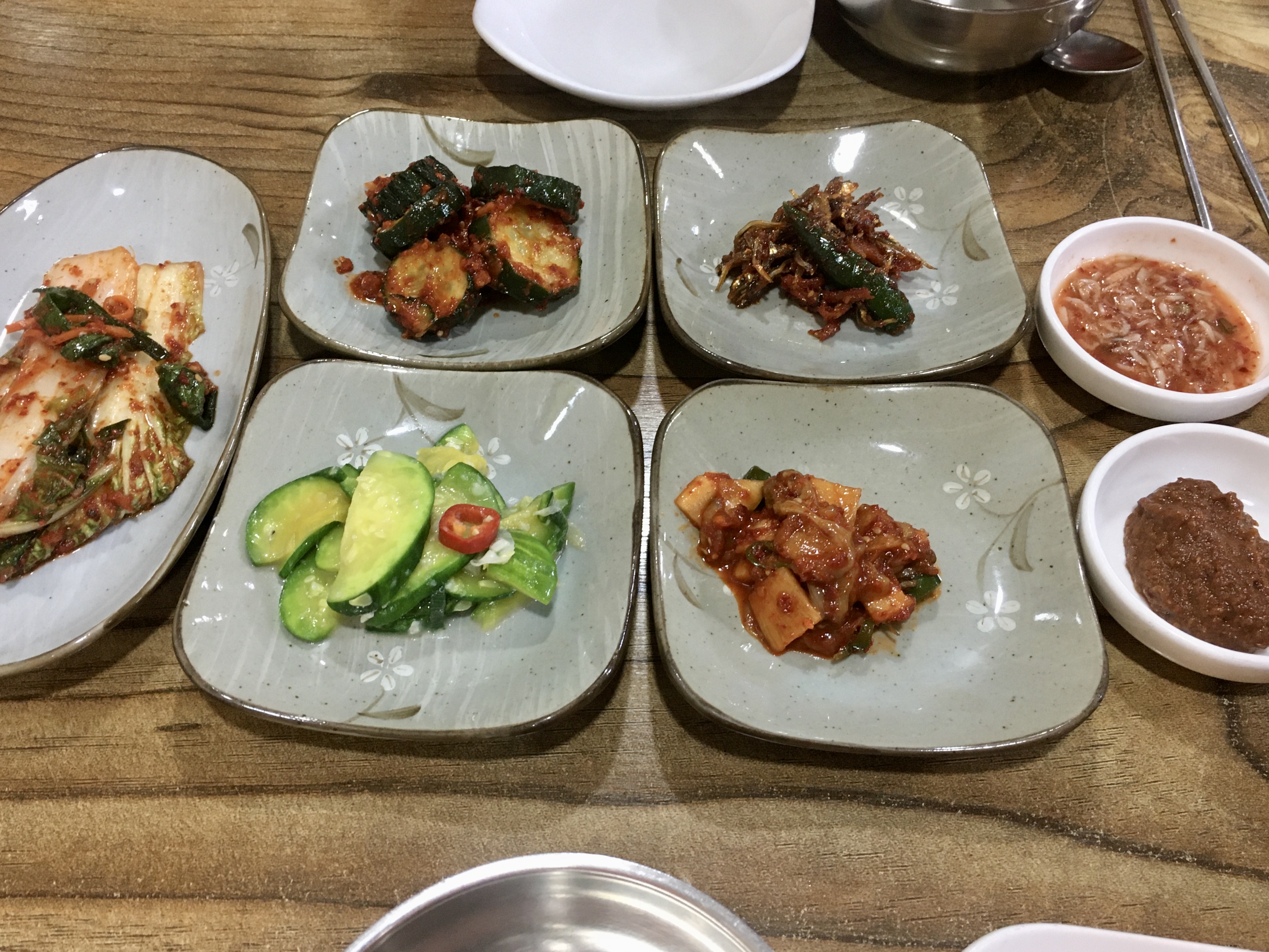배추김치, 젓갈, 호박, 오이, 멸치, 쌈장, 새우젓이 나왔습니다.