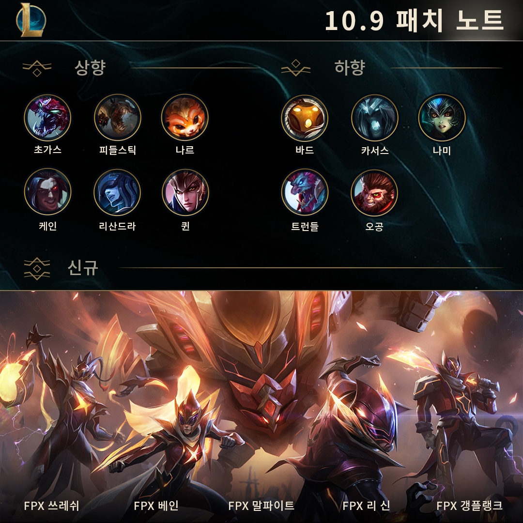 FPX 말파이트, FPX 베인, FPX 리 신, FPX 갱플랭크, FPX 쓰레쉬가 이번 패치 기간 중 출시됩니다.