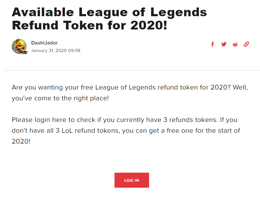 Are you wanting your free League of Legends refund token for 2020? Well, you've come to the right place! Please login here to check if you currently have 3 refunds tokens. If you don't have all 3 L...