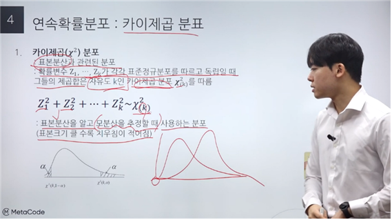 → 표본분산= 통계량, 확률변수 Z1= 정규분포를 따르는 확률변수를 표준화 한 값, 자유도 k: 모수 ← 모양 결정, 확률변수 Z를 각각 제곱해서 더할 때 그 갯수를 의미.
