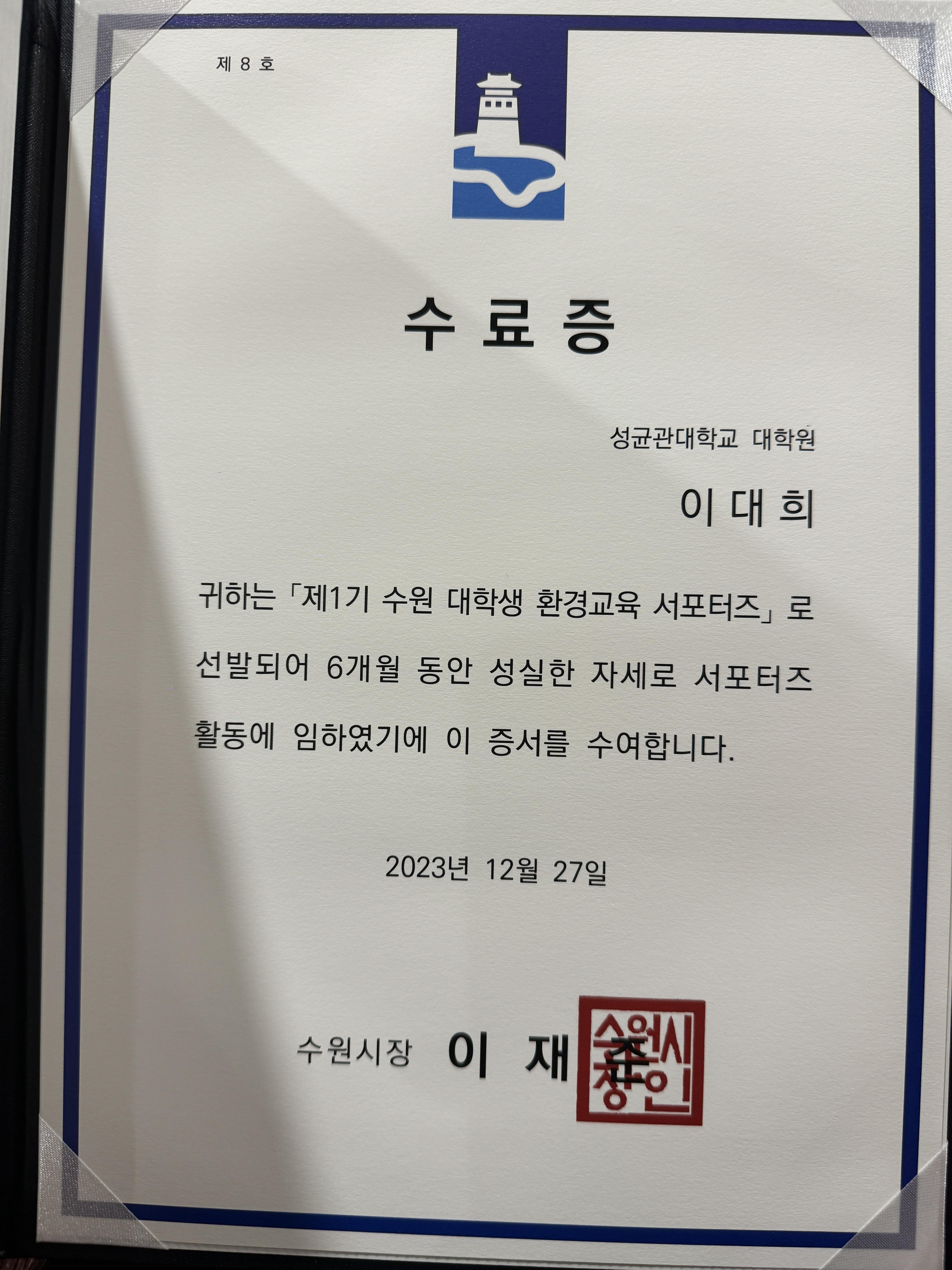 수료증을 받았다.
